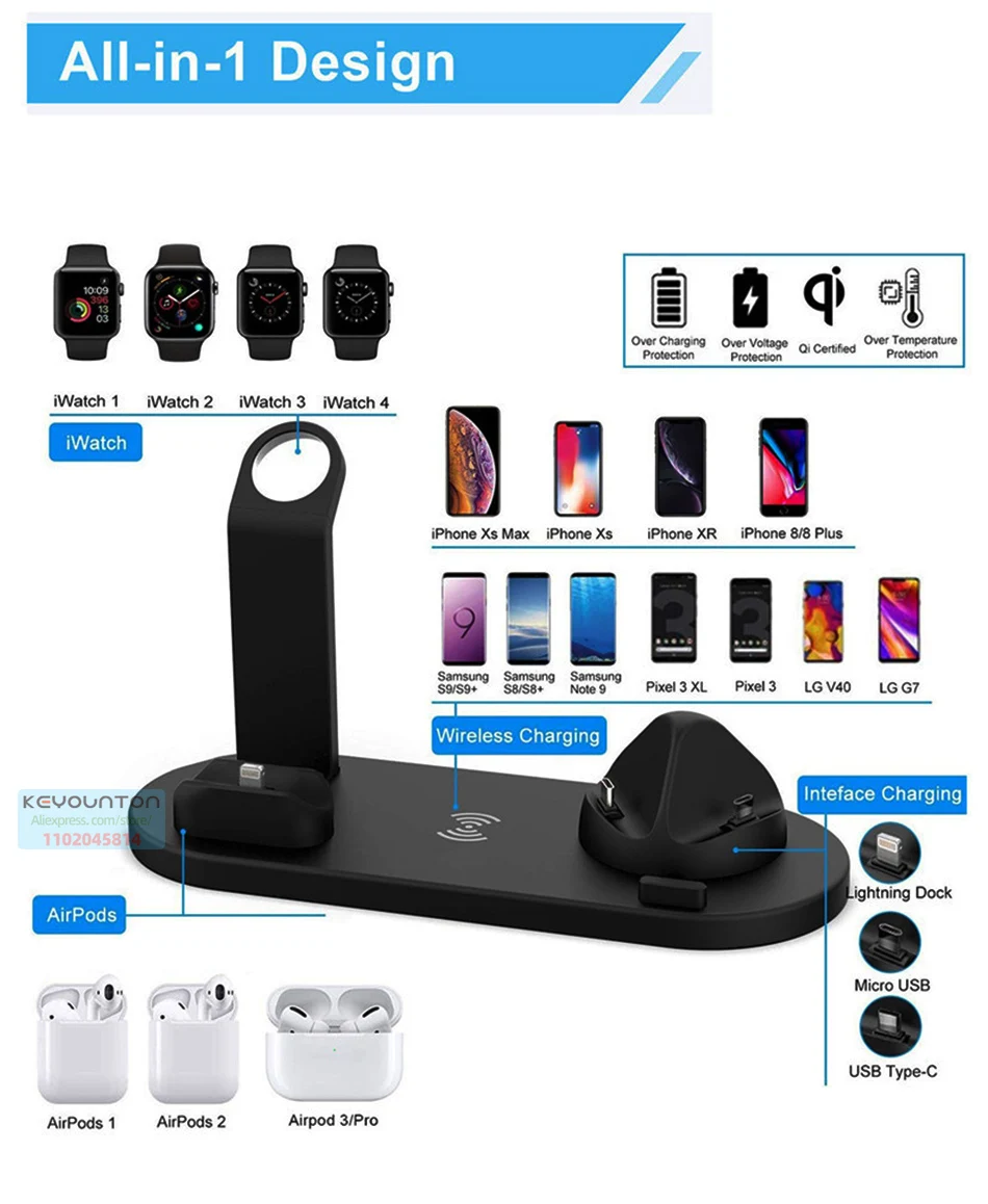 Discover the ultimate charging solution with the Keyounton 6 in 1 Multifunction Wireless Charger Dock. This cutting-edge charging dock is crafted to enhance your charging experience with style and efficiency.